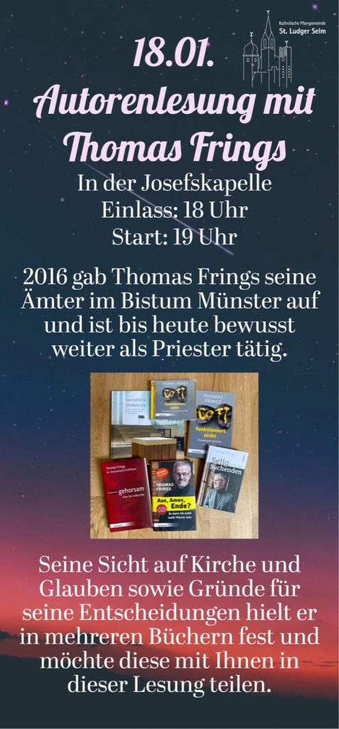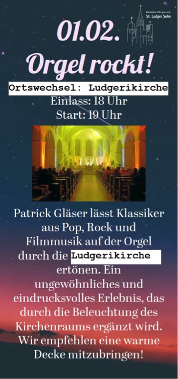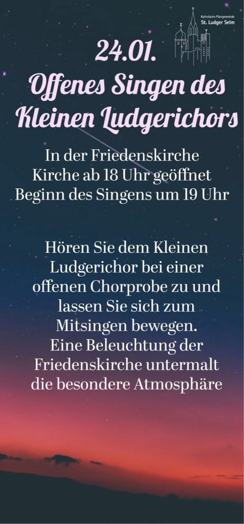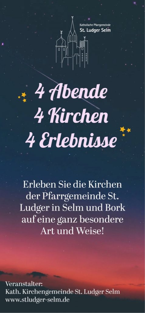Gerne möchten wir mit Ihnen das neue Jahr 2024 unter dem Motto „4 Kirchen – 4 Abende – 4 Erlebnisse“ beginnen und Sie zu besonderen Veranstaltungen in den Kirchen unserer Gemeinde St. Ludger einladen! Die Programme und Termine der einzelnen Abende entnehmen Sie bitte der folgenden Übersicht, die Sie hier auch als Flyer herunterladen können: