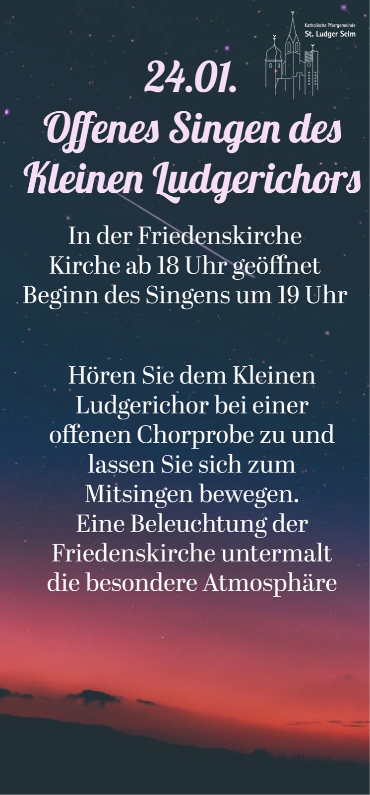 Gerne möchten wir mit Ihnen das neue Jahr 2024 unter dem Motto „4 Kirchen – 4 Abende – 4 Erlebnisse“ beginnen und Sie zu besonderen Veranstaltungen in den Kirchen unserer Gemeinde St. Ludger einladen! Die Programme und Termine der einzelnen Abende entnehmen Sie bitte der folgenden Übersicht, die Sie hier auch als Flyer herunterladen können: