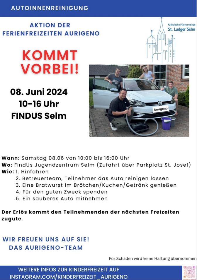 Aktion für die Ferienfreizeit in Aurigeno – Autoinnenreinigung am 08.06.2024 ab 10 Uhr