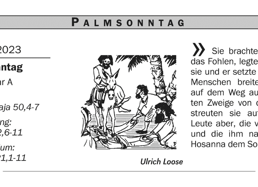 Unsere Gottesdienste Samstag, 1. AprilKollekte für das Heilige Land (Palmsonntag)16.00 Uhr Ludgerikirche: Beichtgelegenheit17.00 Uhr Ludgerikirche: Eucharistiefeier mit Palmweihe, mitgestaltet durch die Sängerinnen Sandra und Serafina Thomüller mit Sechswochengedächtnis; 1. Jahresgedächtnis18.30 Uhr Josefskapelle: Eucharistiefeier mit Palmweihe