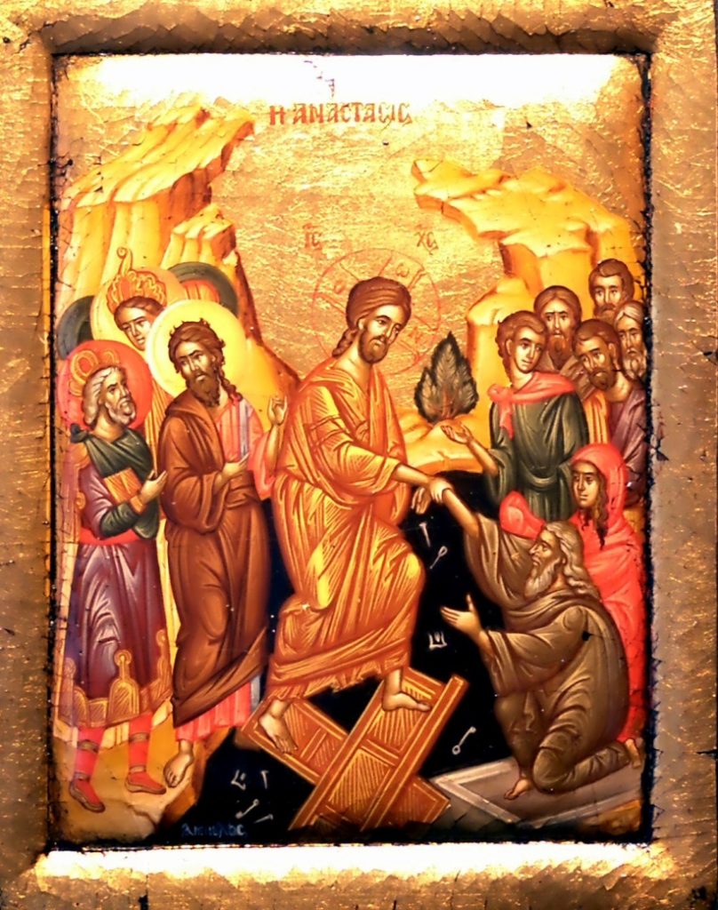 Jesus ist auf der Ikone dargestellt, wie er auf den zerbrochenen Pforten der Unterwelt steht, die unbrauchbar geworden und nie mehr zu schließen sind, und Adam bei der Hand nimmt und ihn aufrichtet. Hinter Adam hockt Eva, die gleichfalls erlöst wird.