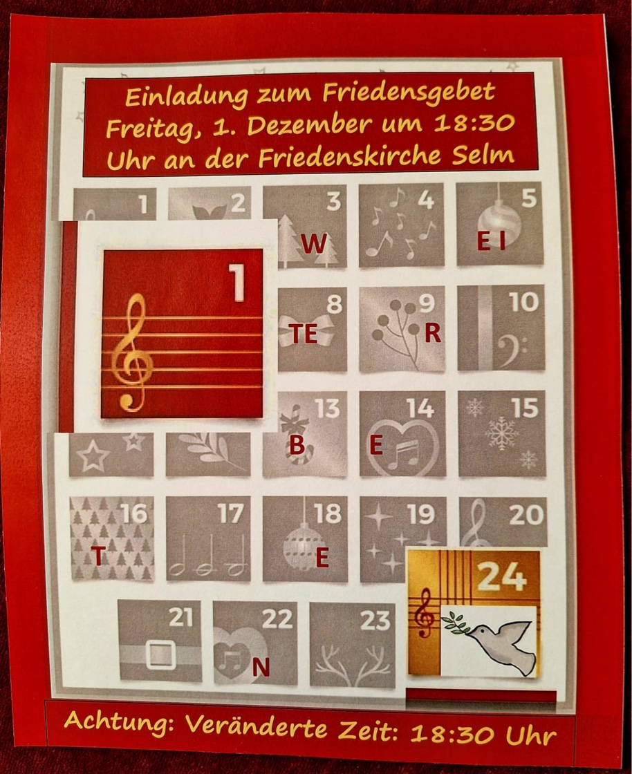 Die katholische und evangelische Kirchengemeinde lädt alle Menschen unabhängig ihrer Konfession ein zum gemeinsamen Friedensgebet an jedem 1. Freitag im Monat. Setzen wir am 1. Dezember um 18.30 Uhr ein Zeichen für den Frieden, beten wir gemeinsam darum, dass der Wille zum Frieden stärker werde und dass Wege zum Frieden gegangen werden.