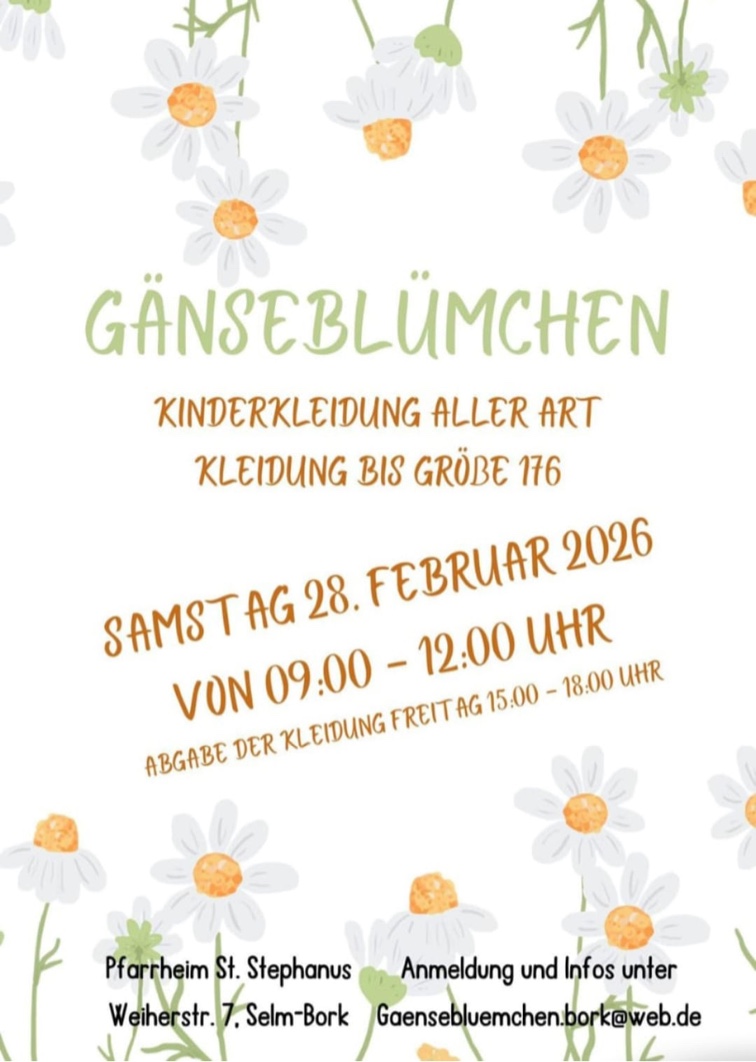 „Gänseblümchen“ – Kinderkleidungsmarkt am 28.02.2026 von 9-12 Uhr im Pfarrheim St. Stephanus