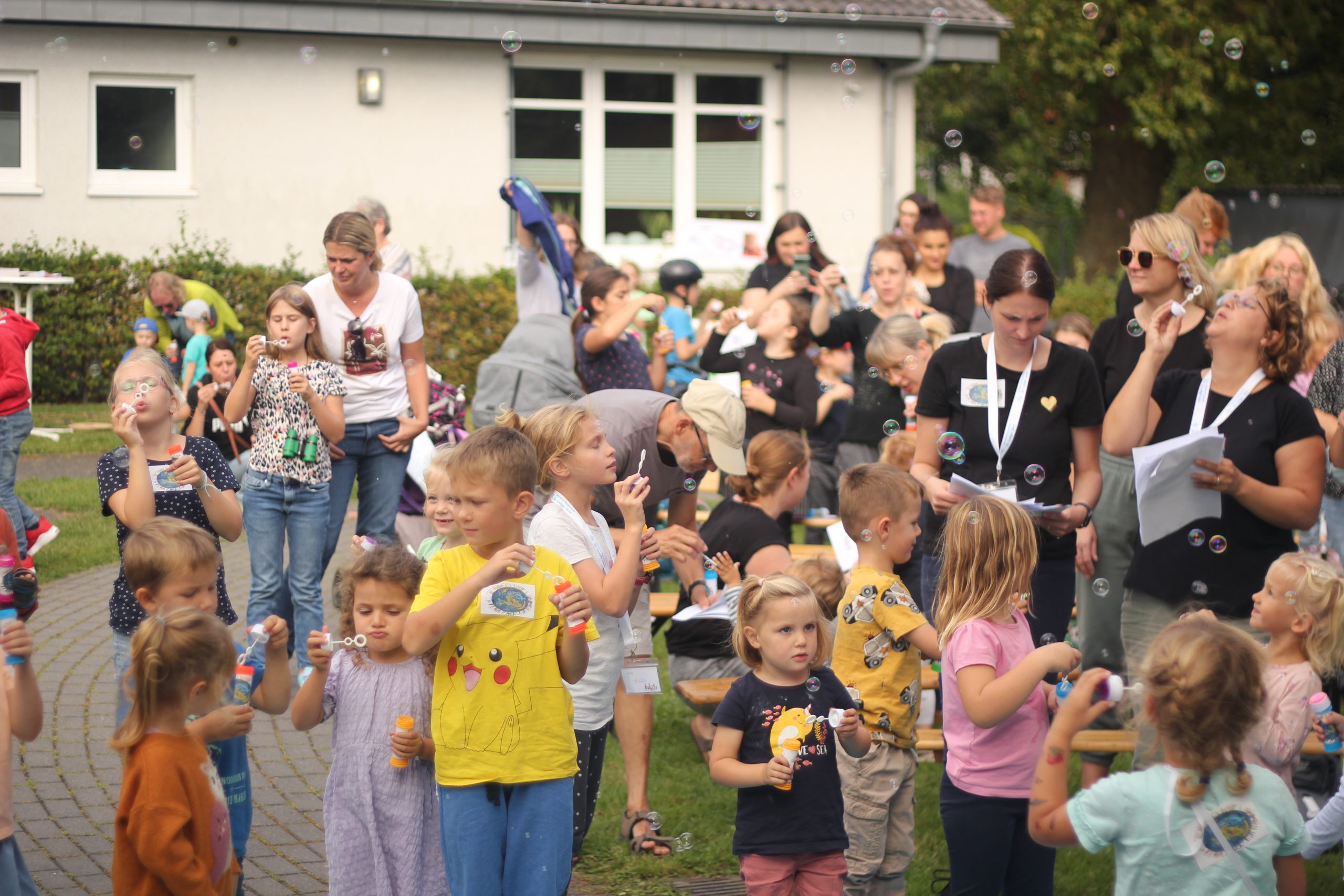 Am Mittwoch-Nachmittag (20. September) war es um 15 Uhr endlich soweit. Das große Fest zum Weltkindertag startete mit einem Gottesdienst, den 200 Kinder und Erwachsene mitfeierten. Thema des Festes war „Jedes Kind braucht eine Zukunft“. „Für die Zukunft hat jeder Mensch Wünsche. Im Gottesdienst waren nicht die materiellen Wünsche gemeint, sondern Wünsche, die man nicht kaufen kann“, erklärt Christina Kostrzewa. Wünsche und Ideen, wie jede und jeder von uns das eigene Leben auf dieser Erde mitgestalten kann. „In der Bibel heißt es, dass Gott die Wünsche deines Herzens erfüllt und alle deine Pläne gelingen lässt, “ ergänzt Pastoralreferentin Nicole Thien. So konnten die kleinen und großen Kinder ihre persönlichen Wünsche und Bitten mit Seifenblasen zu Gott in den Himmel schicken.