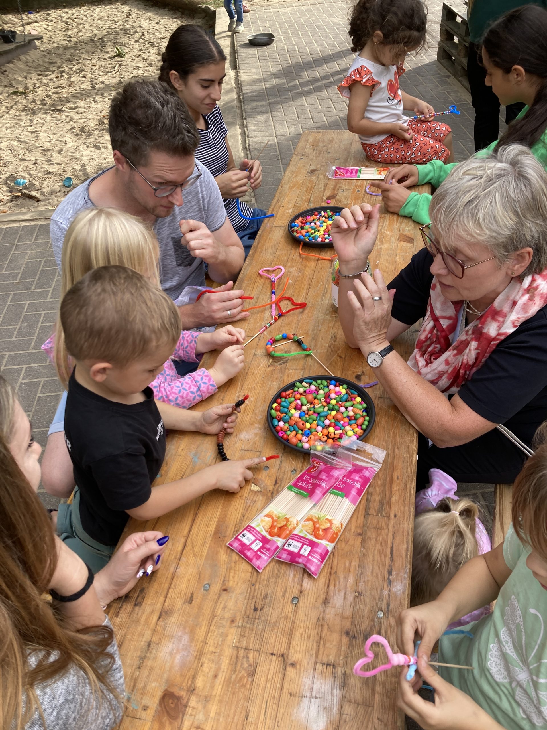 Das Vorbereitungsteam, das aus Mitgliedern des Sachausschusses Familie der Pfarrei St. Ludger, Mitwirkenden der evangelischen Kirche Selm und der Familienbildungsstätte Selm bestand, hatte für den Nachmittag verschiedene Angebote vorbereitet. 200 Liter Seifenblasenlauge standen parat, damit die Kinder mit großen Stäben zu Seifenblasenzauberern werden konnten. Des Weiteren konnten die Kinder bunte Seifenblasenbilder erstellen. „Außerdem wurden 3.000 Perlen, unzählige Schaschlikspieße sowie bunte Pfeifenputzer besorgt, damit jedes Kind einen eigenen Seifenblasenstab basteln konnte,“ ergänzt Laura van Ginneken. „Für das leibliche Wohl wurde ebenfalls gesorgt: Waffelherzen sowie Getränke waren ausreichend vorhanden,“ ergänzt Christiane Köppeler.