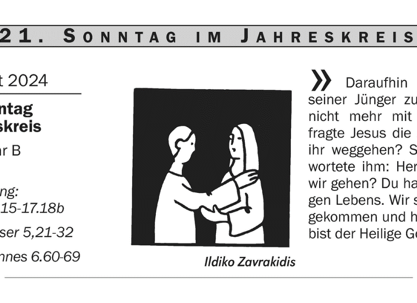 Unsere Gottesdienste Samstag, 24. AugustKollekte: Domkirche in Münster13.00 Uhr Stephanuskirche: Tauffeier f. Maxim Blum17.00 Uhr Ludgerikirche: Beichtgelegenheit bis 17.30 Uhr18.00 Uhr Josefskapelle: Eucharistiefeier Sonntag, 25. August – 21. Sonntag im JahreskreisKollekte: Domkirche in Münster09.30 Uhr