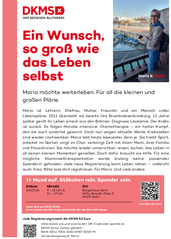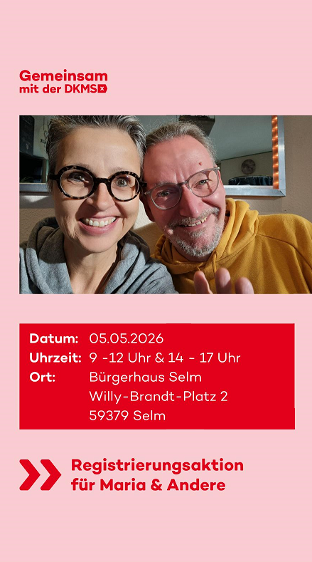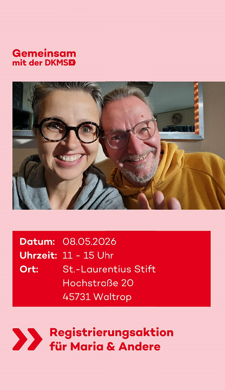Stammzellspende – Registrierungsaktion für Maria & Andere am 05.05.2026 im Bürgerhaus Selm + 08.05.2026 in Waltrop 24. April 2026 Ulrich Temme Aktuelles Suche Suchen nach: Suchen Kirche+Leben im Bistum MünsterWallfahrt 2026 im Bistum Münster: Das planen die kleinen Orte 30. April 2026Münsteraner Pfarrei trennt sich von Kirche – diese Gemeinde übernimmt 30. April 2026Vatikan greift ein: Neusser Benediktinerinnen müssen Kloster verlassen 30. April 2026Zwischen Familie und Kloster: Lüdinghauserin ist jetzt „Gefährtin“ 30. April 2026Verkauf der Antoniuskirche in Münster: Gemeinde kritisiert das Bistum 30. April 2026Einfache Sprache macht den Zauber der Bibel zunichte 30. April 2026Jerusalem: Verdächtiger nach Angriff auf Ordensfrau gefasst 29. April 2026Wieder eine Politikerin als KFD-Bundesvorsitzende? Das sagt Münster 29. April 2026Wegen rechtsradikaler Vereinnahmung: KLB ändert ihren Namen 29. April 2026Charles III. in den USA: Religionen sollen gemeinsam Frieden fördern 29. April 2026