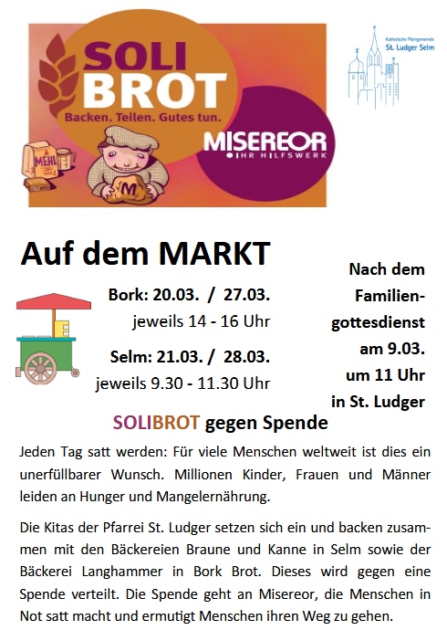 Die Kindertageseinrichtungen der Pfarrei St. Ludger, dazu gehören dazu gehören die Kita St. Ludger, Kita St. Fabian & St. Sebastian, Kita St. Martin und Kita St. Josef in Selm sowie Kita. St. Marien und Kita St. Stephanus in Bork wenden sich in der diesjährigen Fastenzeit diesem Thema im Rahmen des Misereor Projekts „Solibrot“ zu. Sie erfahren im Rahmen einzelner Projektbausteine ganz praktisch, dass sie selbst einen Beitrag leisten können, damit benachteiligte Mädchen und Jungen ein besseres Leben führen können. Spielerisch lernen die Kinder die Grundnahrungsmittel der Welt, Brot, Reis, Hirse und Mais und deren Bedeutung für die Menschen in verschiedenen Ländern der Welt kennen.