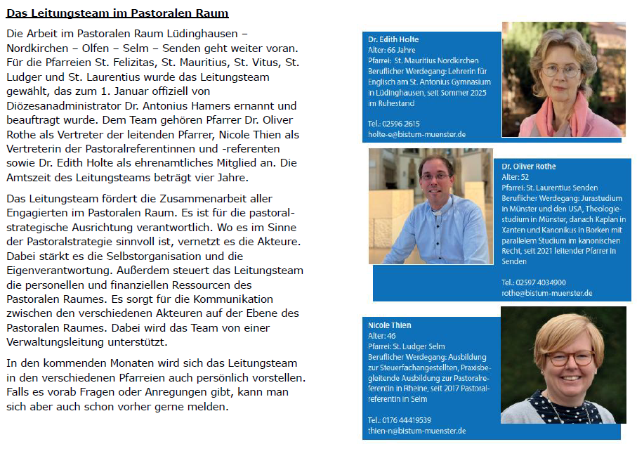 Dem Team gehören Pfarrer Dr. Oliver Rothe als Vertreter der leitenden Pfarrer, Nicole Thien als Vertreterin der Pastoralreferentinnen und -referenten sowie Dr. Edith Holte als ehrenamtliches Mitglied an. Die Amtszeit des Leitungsteams beträgt vier Jahre.