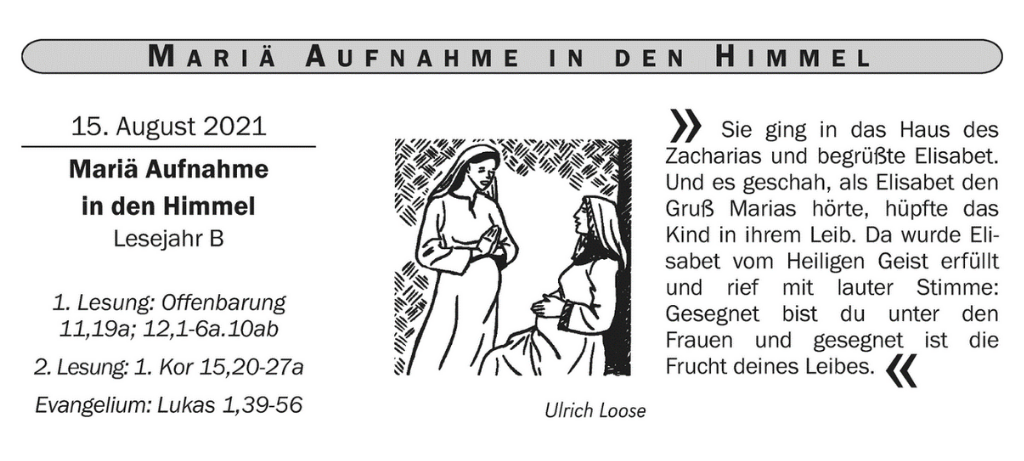 Wenn es darum geht, einen Dienst in der Kirche, einen Dienst innerhalb unserer Glaubensgemeinschaft auszuführen, kann dieser ganz unterschiedlich aussehen – haupt- oder ehrenamtlich; einmalig oder regelmäßig; vom Blumenschmücken bis zum Beerdigen; vom Listenpflegen bis Gruppentreffen organisieren. Hinter diesen Diensten steht immer eine Motivation, die ihren Grund in Gott hat. Gott selbst ist es, der uns ruft, für ihn in unserer Welt einzustehen. Im Evangelium von heute lesen wir von zwei Frauen – Maria und Elisabeth –, die je auf eigene, besondere Weise von Gott in seinen Dienst gerufen wurden.