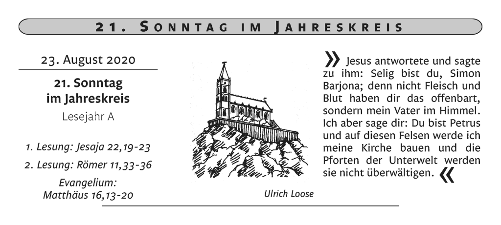 Ich aber sage dir: Du bist Petrus und auf diesen Felsen werde ich meine Kirche bauen und die Mächte der Unterwelt werden sie nicht überwältigen.