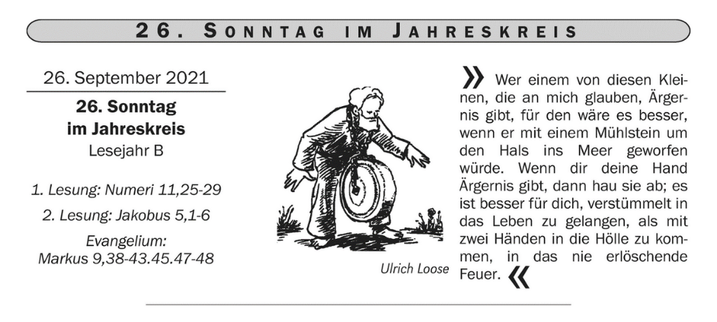 Nachdem Jesus so dem Konkurrenzgerangel eine Absage erteilt hat, tritt er mit seinem Anliegen an die Jünger heran. Dieses Anliegen lässt sich in die Worte fassen: Vergeudet eure Zeit doch nicht mit dem Streit, in welcher Position sich jemand befinden muss, um etwas Bestimmtes an Gutem tun zu dürfen. Hauptsache Gutes geschieht! Verwendet eure Zeit und ganze Kraft vielmehr darauf, euch davor zu hüten, Ärgernis zu geben oder gar jemanden zu verführen. „die Kleinen“ – gemeint ist die Ängstlichen, Zaghaften, zu wenig Selbstbewussten, alle, die sich nur schlecht wehren und nicht behaupten können, die Abhängigen, die oftmals nach der Pfeife tanzen müssen und ausgenutzt werden. Damit die Jünger begreifen, wie ernst es Jesus damit ist, benutzt er dieses erschreckende Bild vom Mühlstein, der dem Verführer um den Hals gehängt werden sollte. Das heißt: Jede Chance eines neuen Auftauchens soll ihm genommen werden.