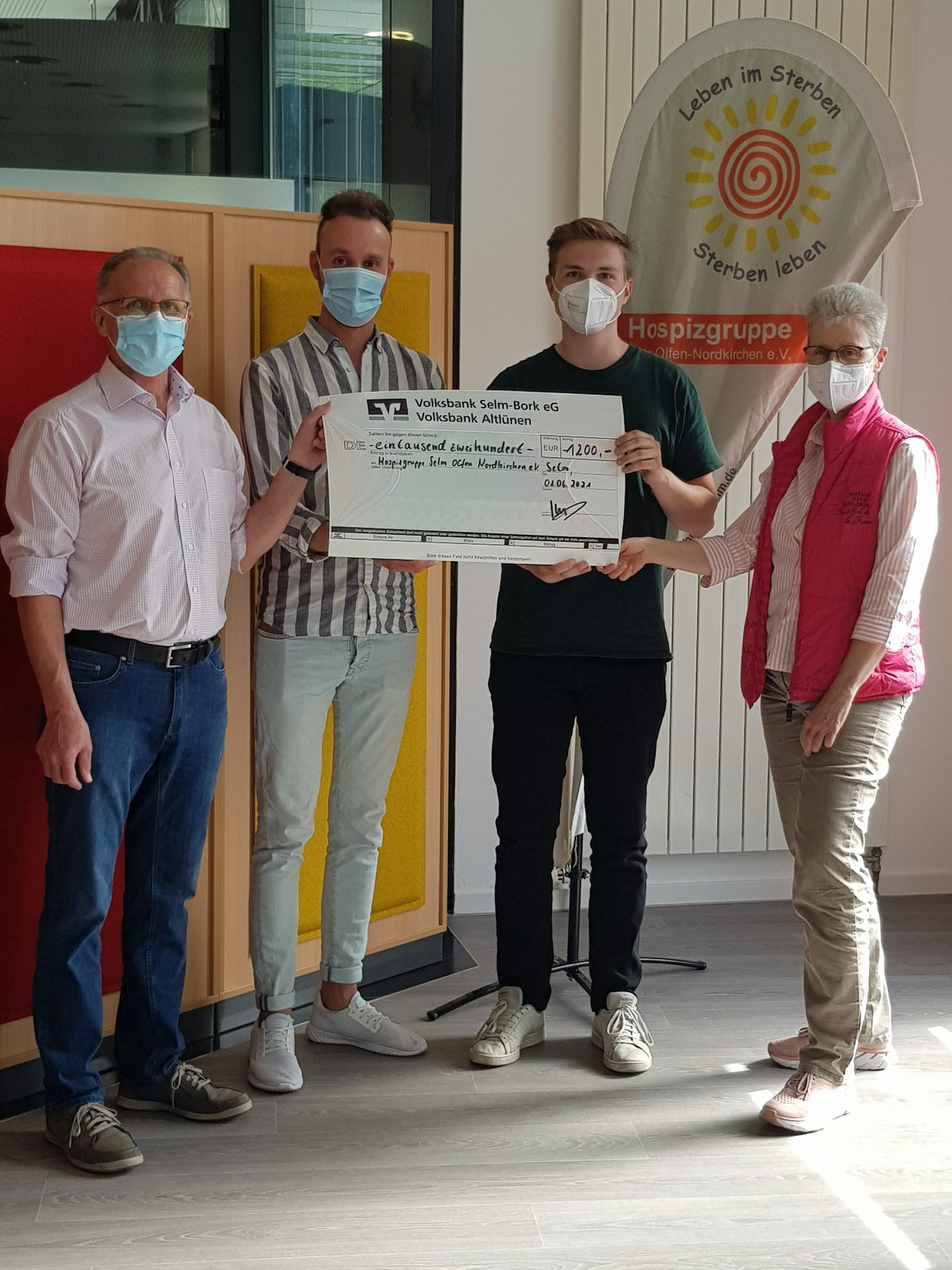 Die Aktion ergab die stolze Summe von 1.200,00 Euro die die Gemeinde, vertreten durch Stephan Schröer und Tim Brinkmann, an die Hospizgruppe übergeben konnte. Die Übergabe erfolgte am 1. Juni 2021, der Tag an dem die Hospizgruppe ihre neuen Räumlichkeiten an der Kreisstr. 51 eröffnete.
