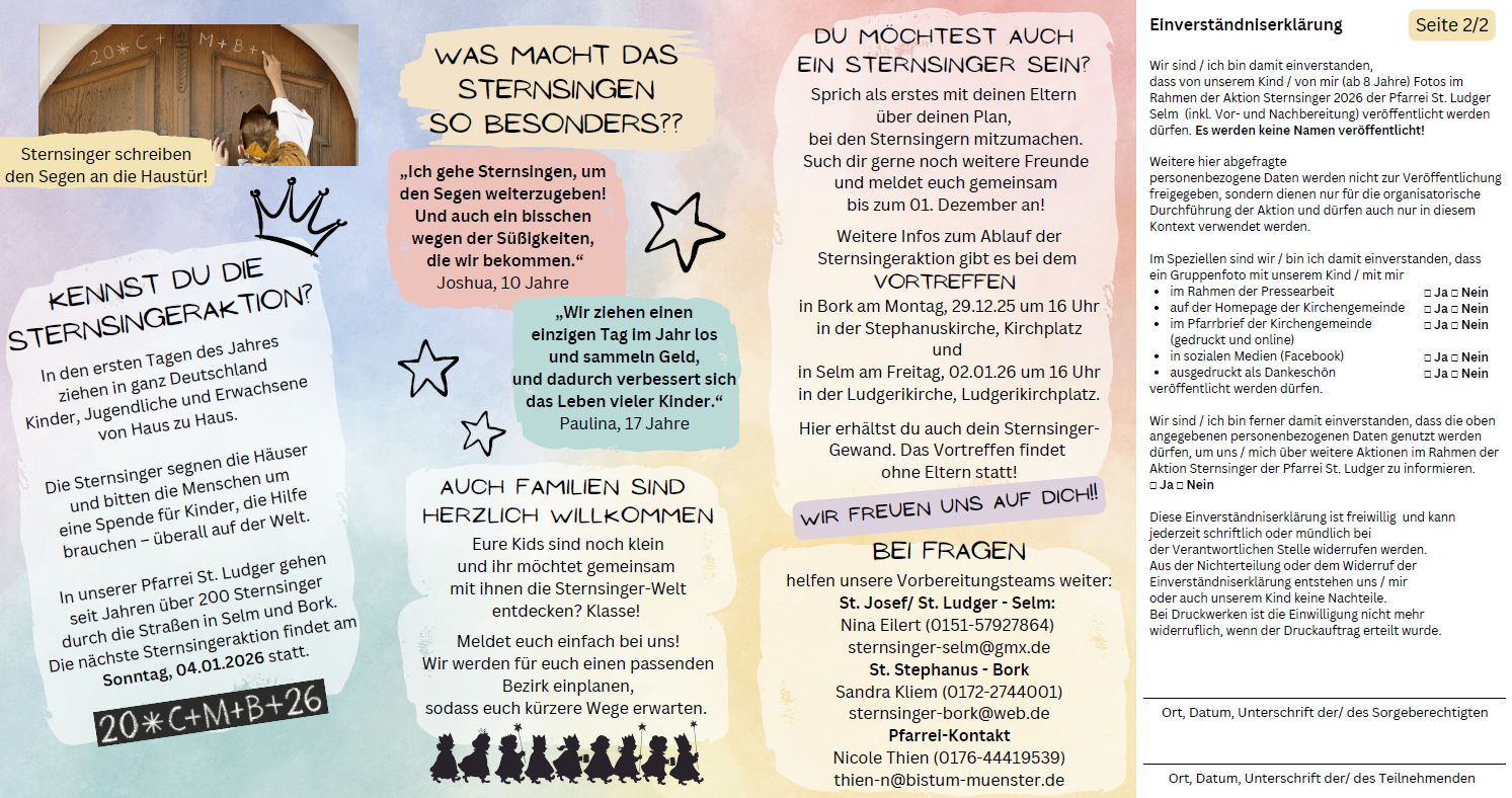 Du möchtest gerne mit dabei sein? Wenn du schon ein Schulkind bist und deine Eltern zugestimmt haben, dann hält dich auch gar nichts mehr davon ab. Deine Anmeldung, die du entweder in Selmer Grundschulen bekommst oder im Internet herunterladen und ausdrucken kannst, muss von deinen Eltern ausgefüllt und in einem Pfarrbüro in Bork/Selm oder in deiner Schule bis zum 01.12.25 abgegeben werden.